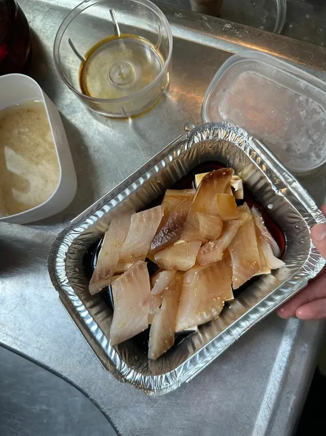 5.把醃製好的鯛魚片鋪在豆腐上,並淋上醬汁