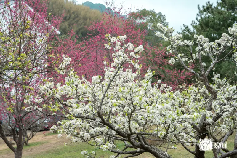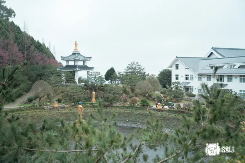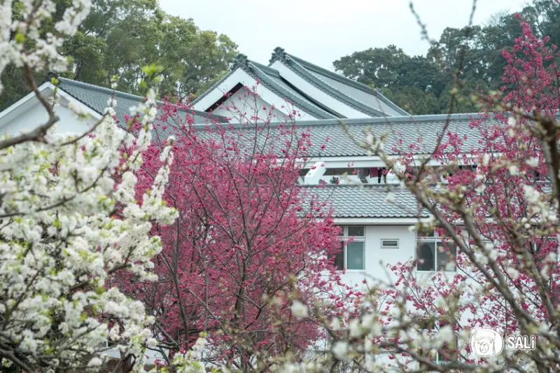 蓮台山妙音淨苑的寺廟建築帶些日式感,拍照時帶些屋簷角度,就能呈現京都氛圍,還有優雅的李花相伴,桃白相間更顯意境