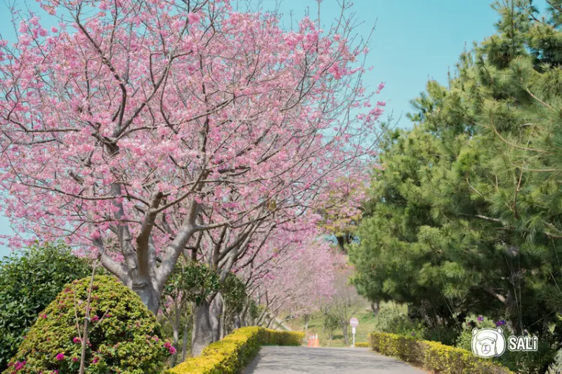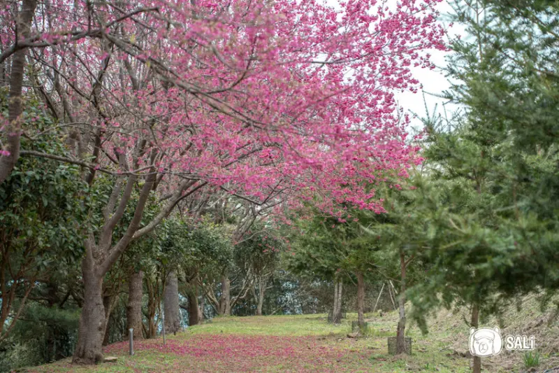 蓮台山妙音淨苑 附設有多處停車場,入場免門票,櫻花種類相當多元,隨著停車場邊栽種,及後方的步道,二月中到訪時,率先八重櫻綻放約六成