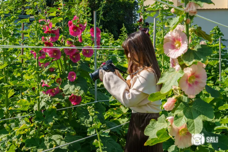蜀葵花能高達三公尺,隨風搖曳的姿態超浪漫,漫步在花田裡,欣賞每種花色細節,園區還有裝置藝術加持,怎麼拍都好看!