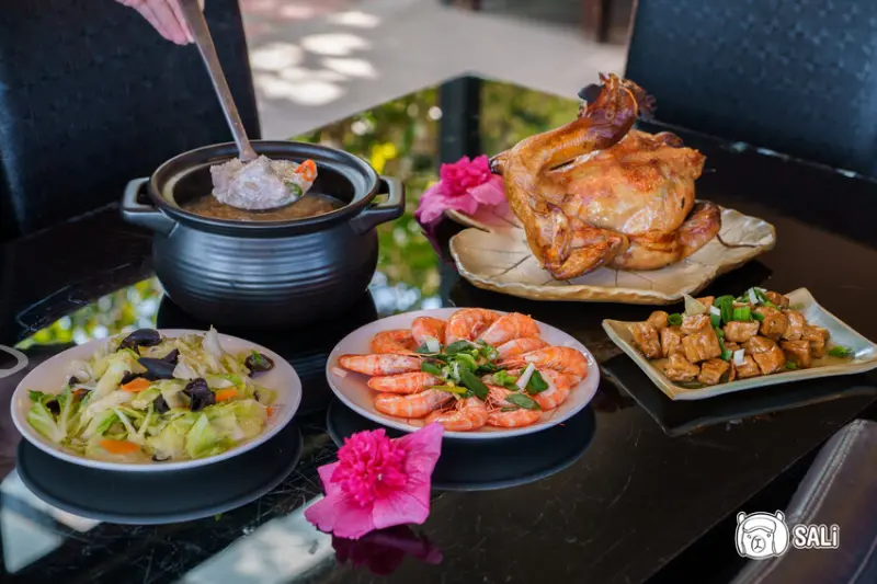 套餐內含窯烤全雞、雞汁芋頭粥、炒時蔬、鮮蝦、滷豆乾,五道菜超適合家庭聚餐或三五好友一起分食!尤其是那剛出爐的雞皮,金黃油亮、香氣四溢,每一口雞肉都超軟嫩多汁,滿滿幸福