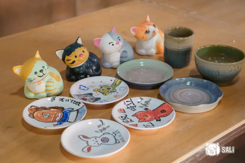 瓷盤彩繪,在五寸小瓷盤上發揮創意,繪製獨一無二的盤飾,每個作品含燒製只要400元,還有超萌的貓咪撲滿彩繪