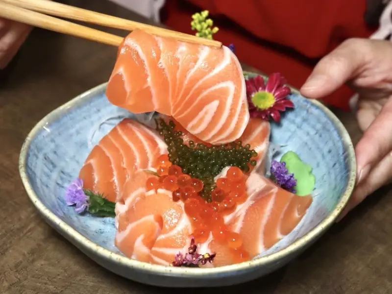 ▼鮭魚每一塊都切得相當厚實有份量,新鮮美味