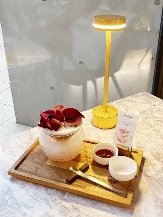 超適合告白的花漾瑰蜜,荔枝花茶和義式咖啡完美融合清爽好入喉,使用的是台灣南投可食用玫瑰,沾著覆盆莓醬,聞香瓶有股淡淡的玫瑰香,超浪漫超有儀式感!