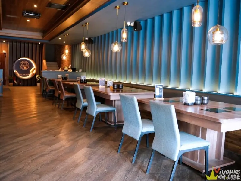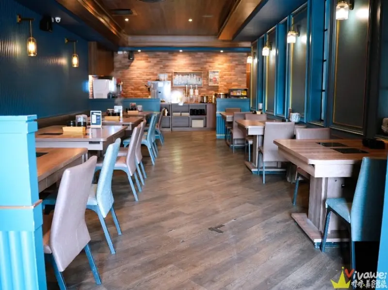 ▲「金蒔鍋物」店內是木質地板搭配普魯士藍的色調~是歐風餐酒館的質感風格!空間很寬敞舒適,桌距和走道的距離拉得很開,用餐起來不會有壓迫感👍