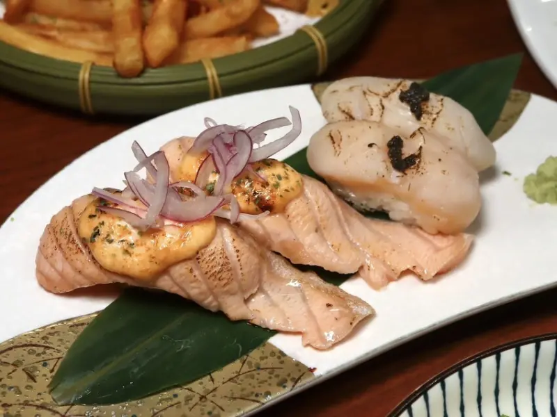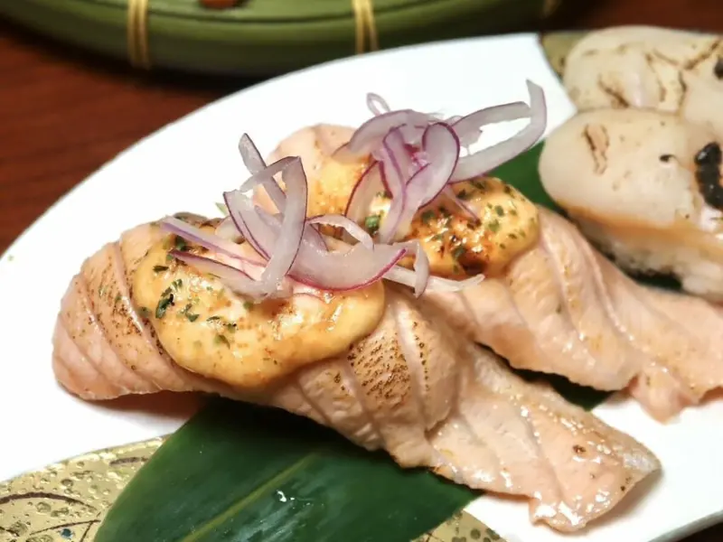 ▼超愛這個「炙燒明太子鮭魚握」,鮭魚給的超大片一口塞都有點吃力XD 擠上特製明太子醬再炙燒,帶出逼逼波波的口感。頂端放上生洋蔥絲解膩增添層次