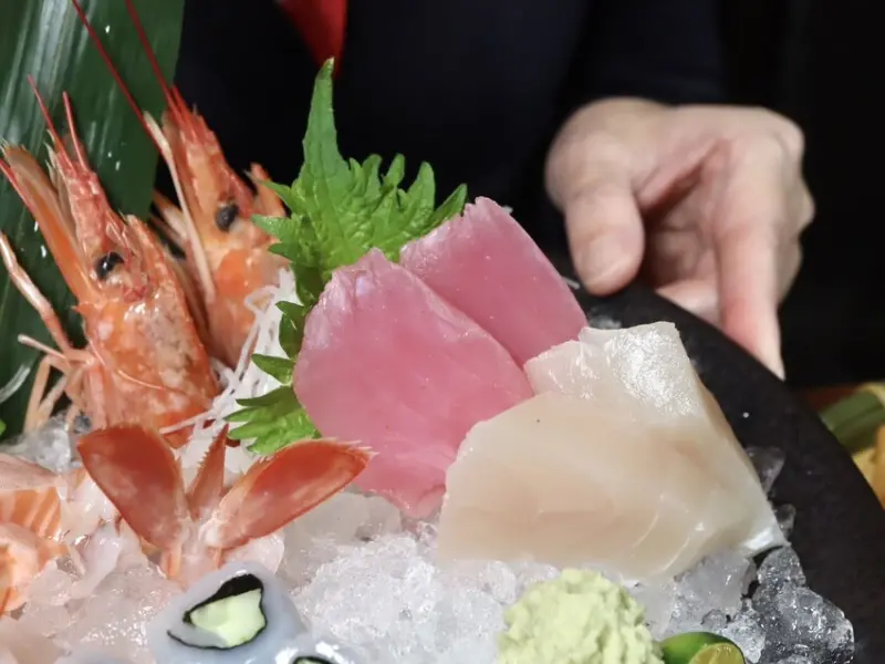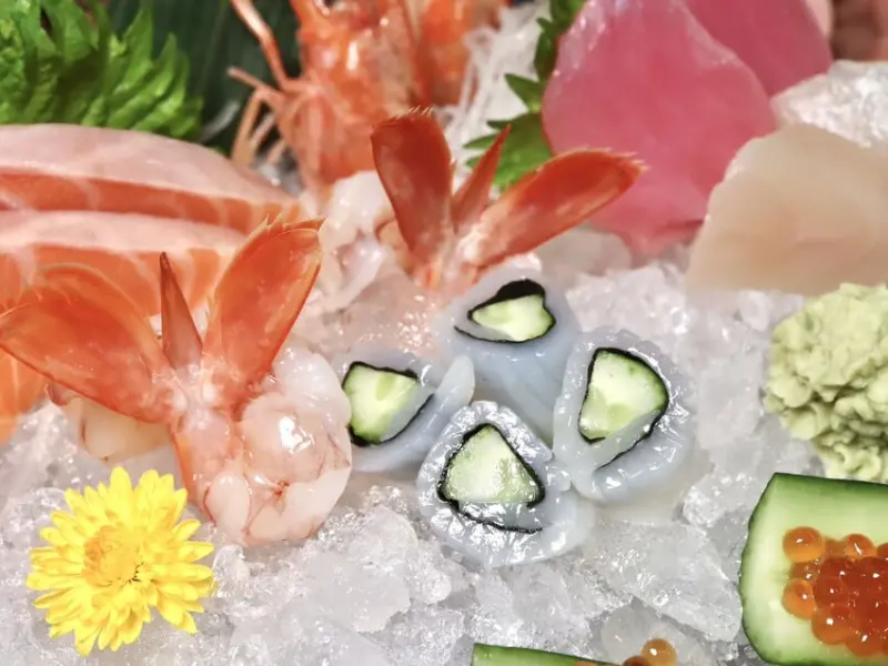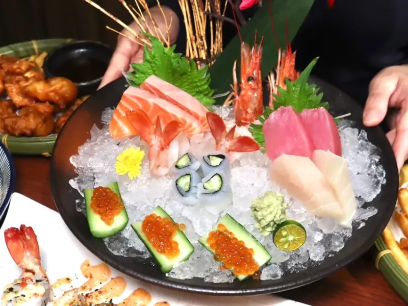 ▼狗一下還可以點到新鮮的生魚片!綜合生魚片一次可以吃到旗魚、鮭魚、鮪魚、花枝、天使紅蝦、還有小黃瓜鮭魚卵。一整盆端上來超級霸氣~擺盤也好好看很好拍照