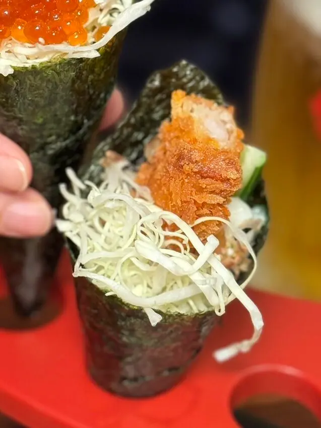 ▼這盤必點我很喜歡!頂端厚實蝦肉搭配捲壽司,內餡夾著玉子燒、爽脆時蔬、蟹肉棒、點端再淋上明太子美乃滋醬提味,一口塞入口中層次很豐富。