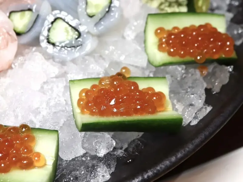 ▼鮭魚卵好像寶石一樣閃閃發光,鮮甜的海味搭配底下脆口的小黃瓜很清爽
