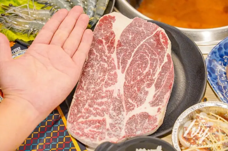 大胃王和肉控們,千萬不要錯過「冷藏熟成頂級牛排」,比臉大的牛排一上桌超吸睛,牛排油花和厚度都表現得還不賴,但我想很多人都不知道怎麼烤吧XD