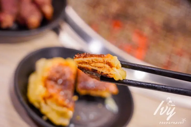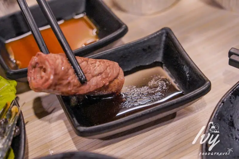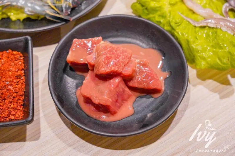 嚴選美國和牛的肉片也給得很豪爽,上面油花是漂亮的雪花狀,同樣烤到5~7分熟度,入口咬感軟嫩多汁,佐上干蝶粉味道更足。