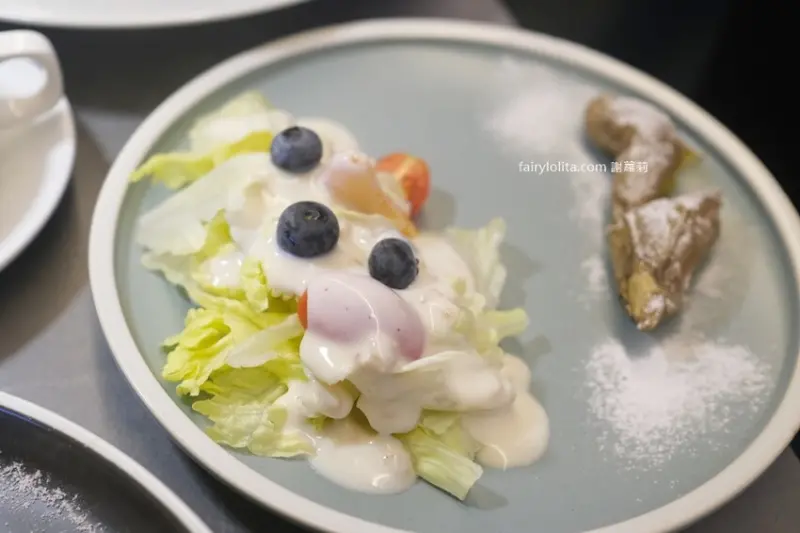 附餐還有沙拉部份,是比較精緻小巧的份量,但是我超愛它的佐醬,帶有濃濃的果香味,讓生菜瞬間美味升級,連配料都是蒸過的地瓜,甜甜的,也很美味。