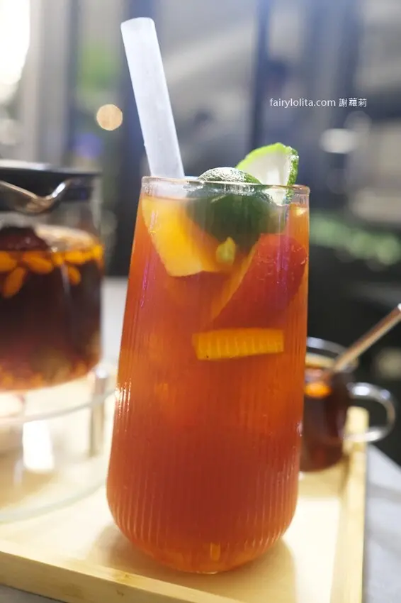 這杯我自己真的很推薦,喝起來就像是現榨的水果汁,裡面擁有超多豐富的水果,除了喝茶之外、還有許多水果可以吃,這杯CP值真的超高。