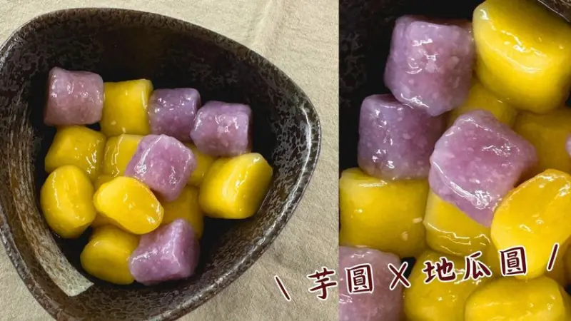 首先芋見地瓜圓下熱水滾,等芋圓、地瓜圓浮起來之後
