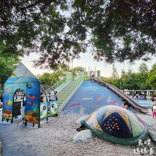 滑梯遊具下還有沙坑設施,在下方玩沙還有遊具遮蔽陽光,喜歡玩沙的孩子記得帶玩沙工具來。