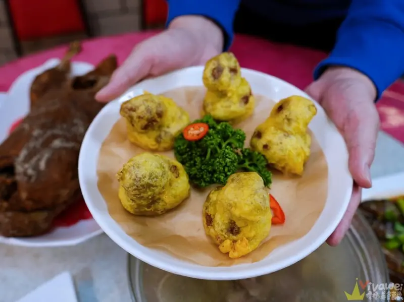 ▲芋香鴨將剁碎的鴨肉和鹹豬肉先炸後炒,再加入芋泥、蛋、香蔥油與客家桔餅等20幾種客家元素!餡料鬆軟綿密~是一道客家風味十足的特色料理!