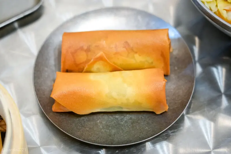 鮮蝦韭菜炸春捲外皮酥脆,每一口都能咬到紮實內餡,韭菜香氣濃郁,多汁又有飽足感!