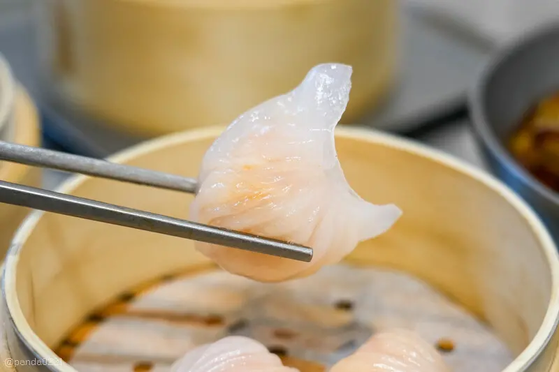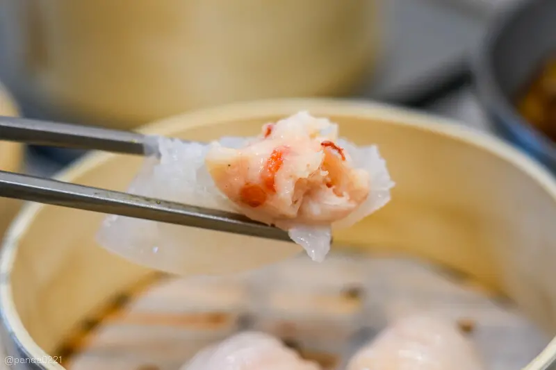 蝦餃晶瑩剔透,粉紅的蝦餃皮薄餡多,咬下去Q彈十足,每顆都滿滿的蝦仁,鮮甜口感很實在!
