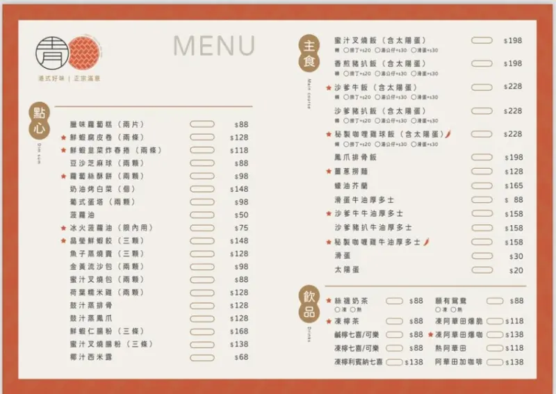 青亭點水茶餐廳的菜單包含點心、主食和飲品,每道港點皆由師傅用心手工製作,每天的量一售完就沒有囉!