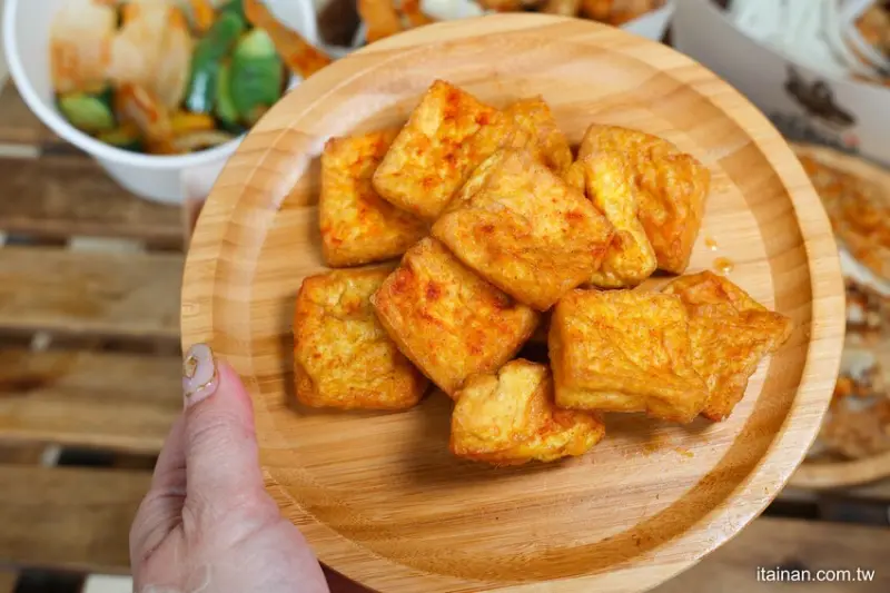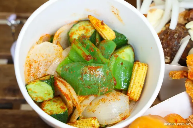 炸蔬菜我們點了滿多種類的,像是小黃瓜、玉米筍、青椒、炸洋蔥還點了雞蛋豆腐,我覺得最特別的是他們竟然有賣炸洋蔥,而且我喜歡他們炸的熟度真的很剛好,保有青脆感,蔬菜跟豆腐還會幫客人量外裝一盒,乾乾淨淨的,以往買鹽酥雞都是把蔬菜都豆腐裝在紙袋,紙袋每次一回家都油膩膩的,這樣裝多乾爽阿。