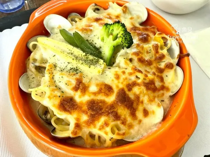 蛤蜊、義大利麵及起司都是明太子的最愛,就這麼剛好,奶油白酒蛤蜊焗烤麵成了他的首選!夠份量的焗烤麵,伴隨著高溫的熱起司,香氣四溢。唯一稍嫌美中不足的是,起司並沒有巴在麵條上,比較像是焗烤蛤蜊,上下層口感分開了。
