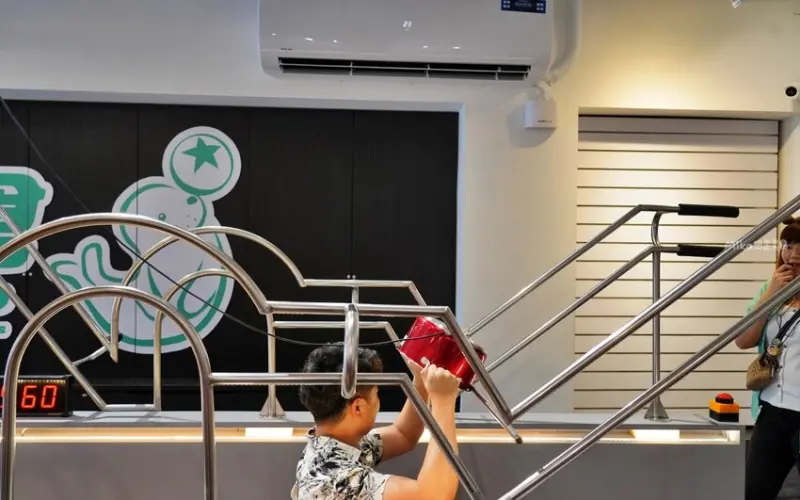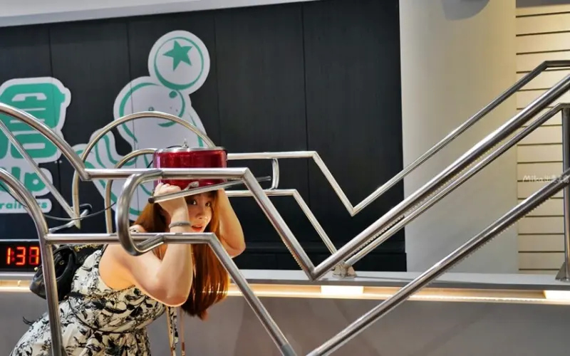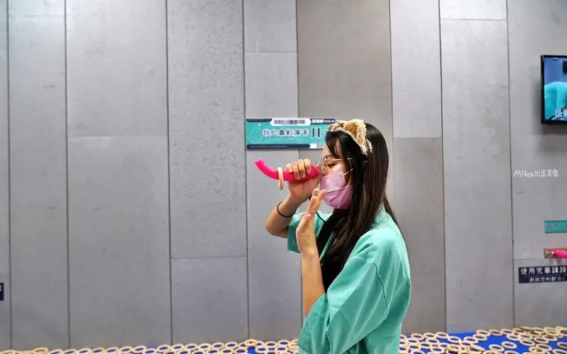 將彩色彈簧放在頭頂,由下往上彈起時要用頭頂接住,沒散開就算過關。但因為這關真的太難,所以大家全都挑戰失敗,倒是工作人員示範時不小心過關,她超驚喜的,她說自己第一次過關,哈哈哈。