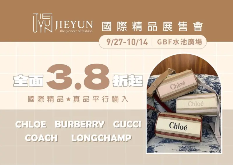 今年大江購物中心還加碼了兩個特賣會,9/27~10/14在GBF的水池廣場有JIEYUN國際精品展售會,會有COACH、GUCCI、BURBERRY、LONGCHAMP、CHLOE等精品品牌。