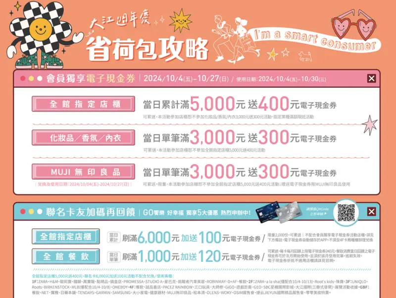全館指定店櫃消費累計滿5000元送400元電子現金券,化妝品、香氛、內衣單筆消費滿3000元送300元電子現金券,無印良品優惠是單筆滿3000元送300元電子現金券。