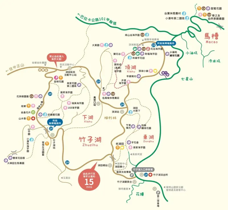 這張就是竹子湖的詳細地圖,除了停車和廁所等資訊,還蒐羅了所有的海芋田和繡球花所在位置,相當適合按圖索驥呢🔍!