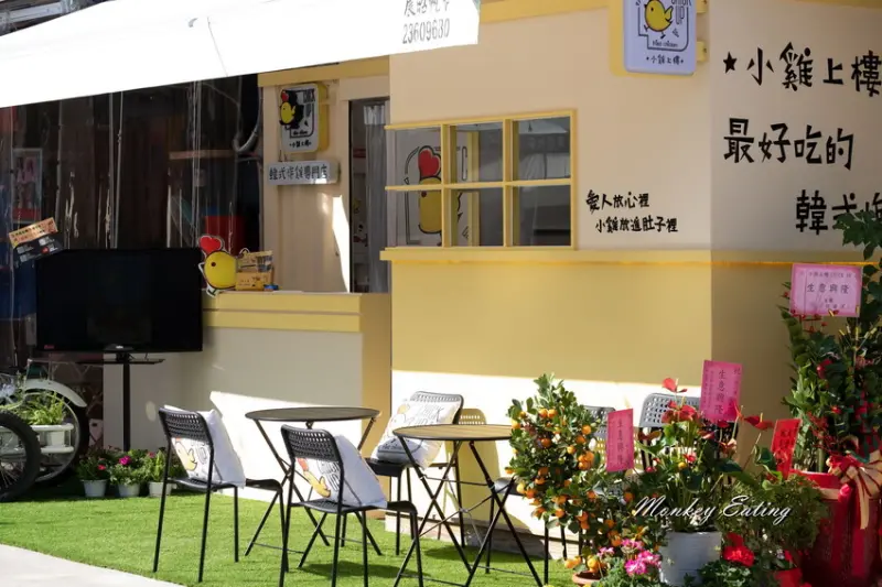 看到黃白相間的小店就是囉~可愛的小雞LOGO會讓人忍不住多看幾眼,雖說以外帶為主,店門口也擺放了幾張桌椅讓客人可以在這邊休息吃東西~