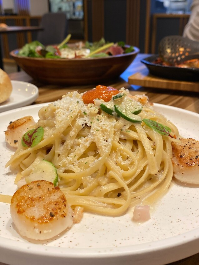 明太子醬濃郁到每一根寬麵都裹滿鹹香