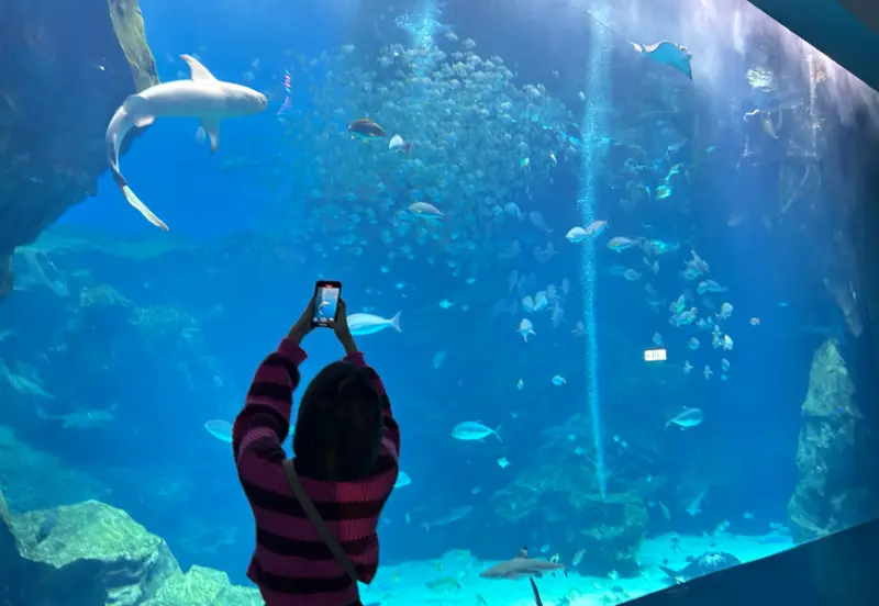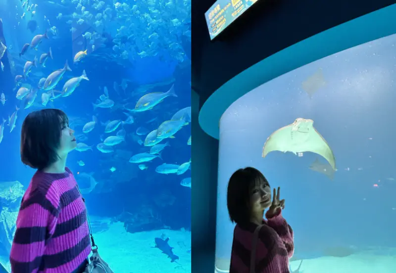 巨型水槽也是很適合拍IG打卡照的地方,現場的燈光可以清楚拍到與魚群的合照,讓人心滿意足帶回珍貴的回憶。當你回去工作累了的時候,可以翻出來看看,重新回想起面對大海的那種開闊,水中生物的悠然自得。