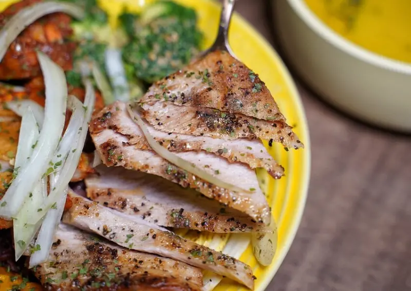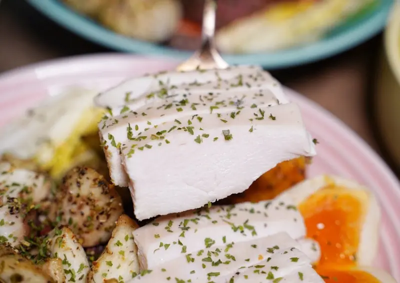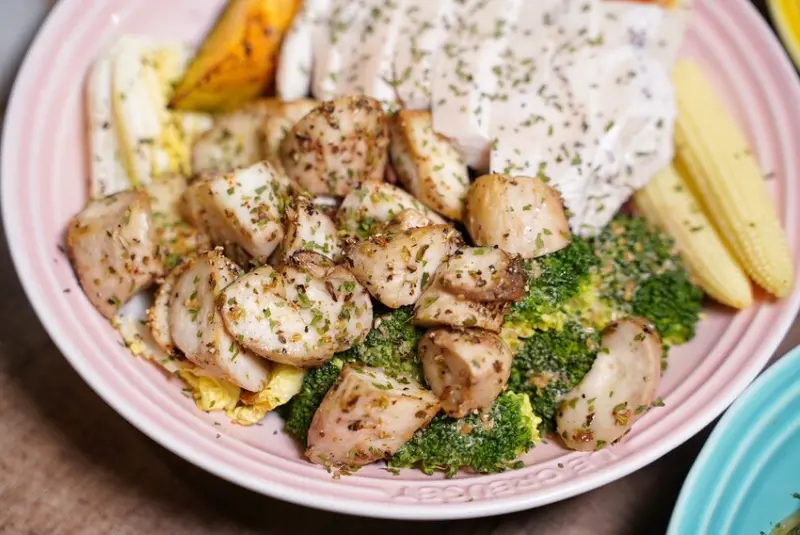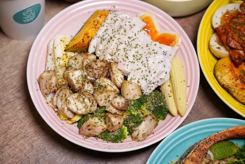 有在飲食控制的朋友,推薦你「低脂雙拼」,主餐有超嫩的舒肥雞胸肉以及咬下去會爆汁的香烤義式杏鮑菇,再搭配五樣配菜,熱量僅600初頭就能吃得飽飽飽。