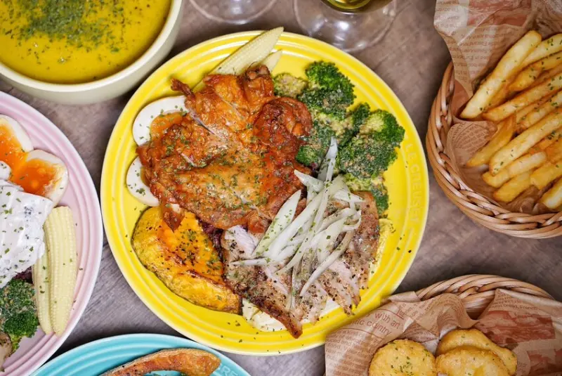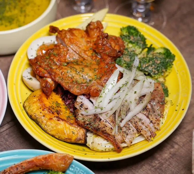 松阪豬烤得外酥內嫩,咬起來又脆又彈牙,撒上特調芥末椒鹽,鹹香中帶著微微辛香,有夠開胃。另一半是西班牙煙燻雞腿排,一樣很讓人驚艷,表皮烤得酥脆,肉質卻保有彈嫩多汁,煙燻香氣完美滲透每一吋雞肉。