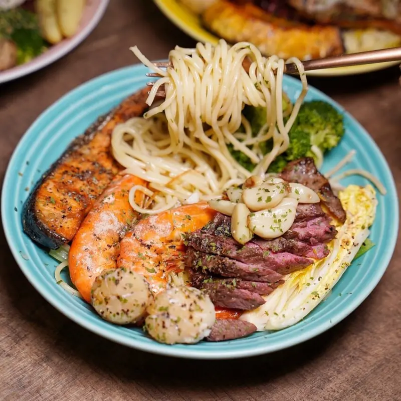 重點是義大利麵也是蒜香味十足,給你低脂高蛋白,吃完真的超有飽足感。