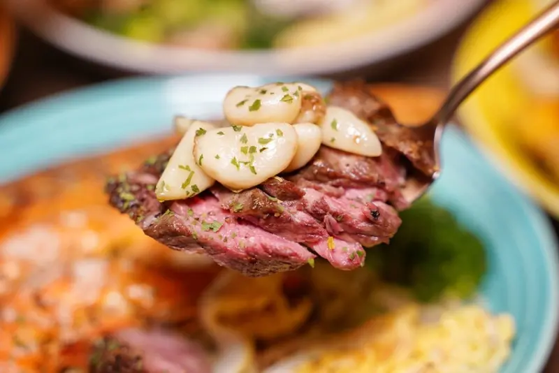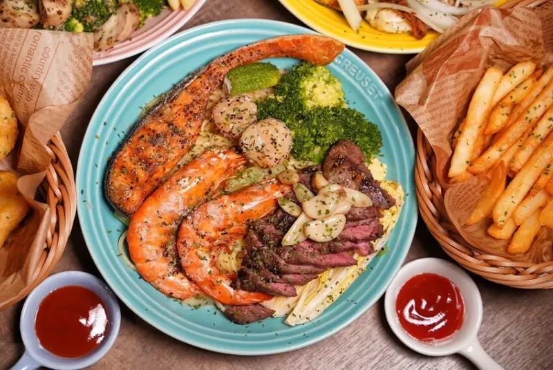 鮭魚外脆內鮮嫩,干貝也非常大顆鮮甜,粉嫩的牛排搭配油封蒜頭享用更對味!椒鹽烤蝦也是鮮甜彈牙~不愧是用50萬蒸烤爐做出來的料理,