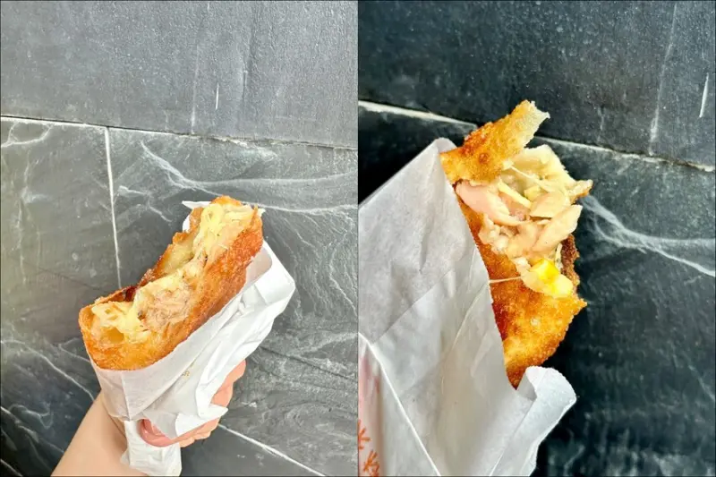 先來看看這個金牌鮪魚牽絲餅($85元),(左邊那張圖)它搭配的是紅記超厲害的鮪魚醬加上金黃的玉米粒,濃郁的鮪魚內餡搭配香甜的玉米粒,鹹甜的滋味再加上恰到好處的黑胡椒香氣,我整個超喜歡!而且如果你喜歡鮪魚餡但是又怕洋蔥的話,可以大膽吃他們家的鮪魚口味,因為裡面是很單純的鮪魚跟美乃滋調醬,讓你吃到最香濃的鮪魚醬味喔!
