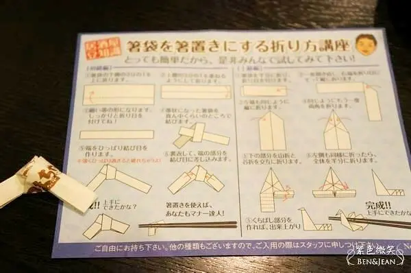 哈哈,連竹筷子的紙封套也提供教學,折的像隻紙鶴,好厲害啊,這樣等餐點上桌時還可以玩玩看