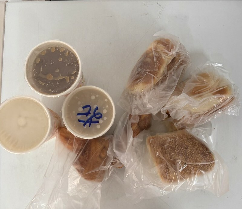 兩組燒餅油條,厚蔥花燒餅、雙胞胎、麻花各一,豆漿、米漿、花生湯都來一杯。