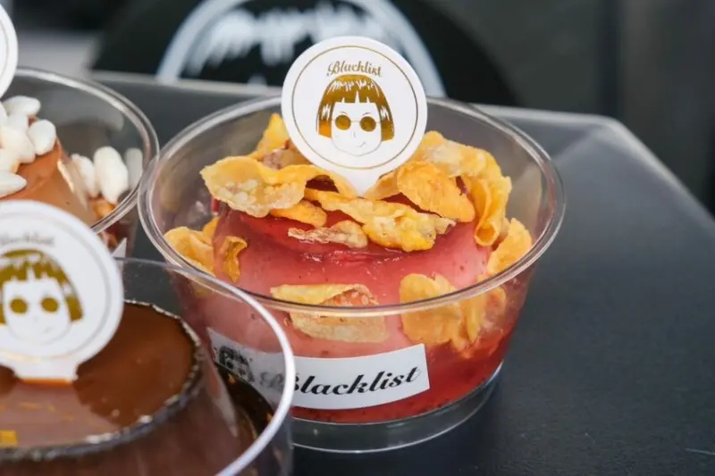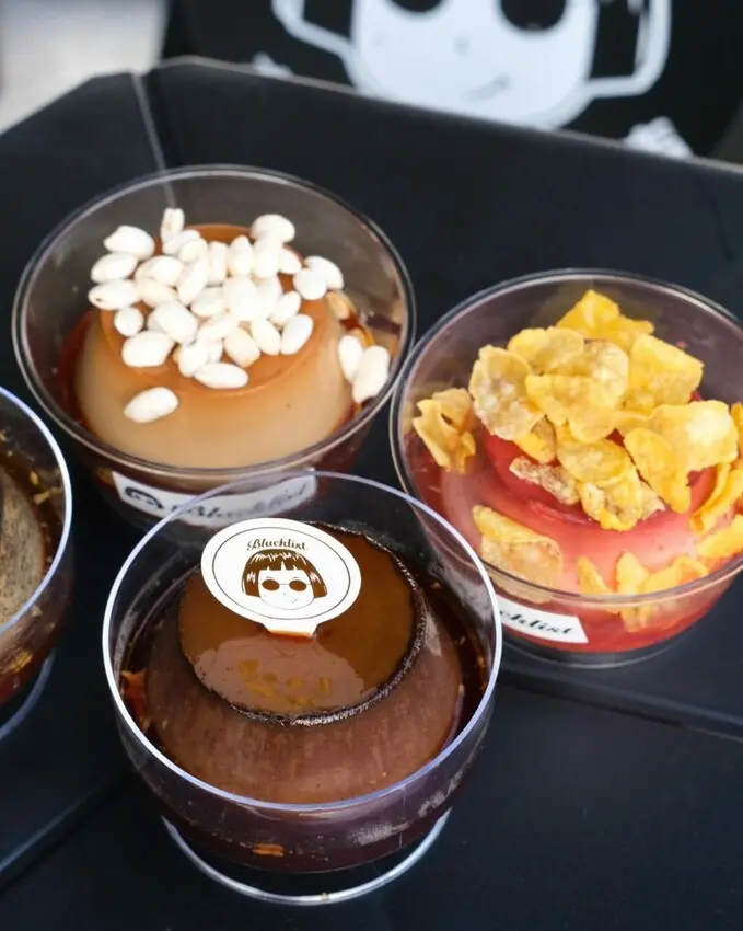 ▼【𝖡𝗅𝖺𝖼𝗄𝗅𝗂𝗌𝗍 黑名單】的布丁除了可以單吃,也能加價另外加配料,有小麻糬(20元)、米香(10元)及玉米脆片(10元),推薦大家一定要加,口感層次都會更豐富!