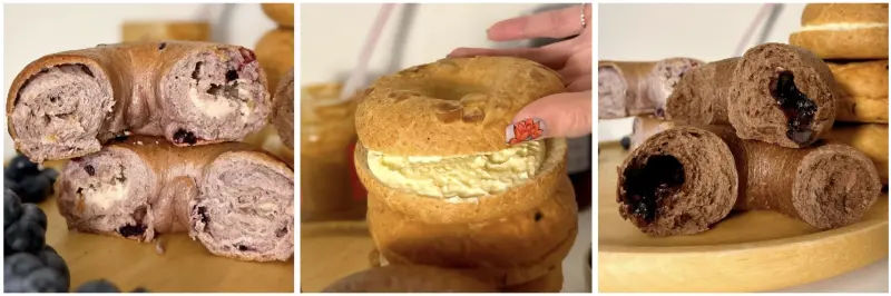 這款是雪莉心目中甜的貝果推薦口味第一名!不只使用藍莓果醬,而是有大顆的野生藍莓果乾,剛出烤箱便能聞到藍莓的天然甜香。中心夾餡滿滿的鮮奶油乾酪搭配藍莓果醬,口感濃郁細膩,帶有藍莓的酸甜與淡淡鹹味。