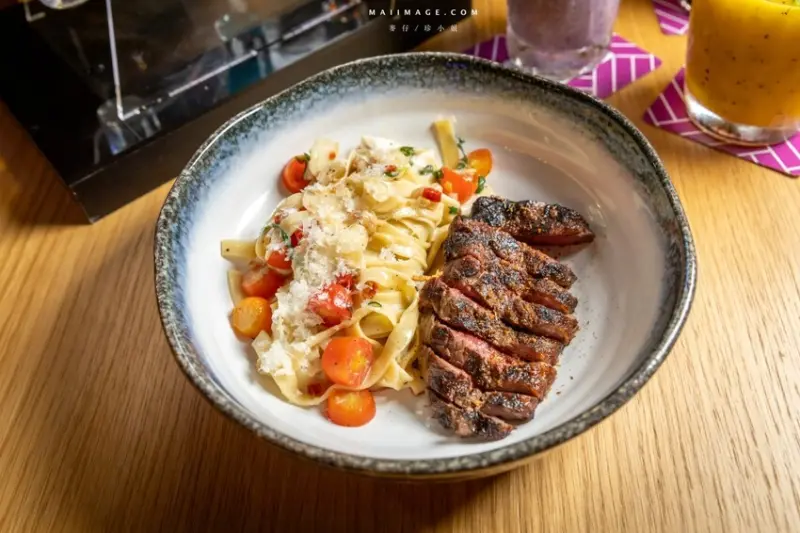 這道是烤牛肉搭配蒜味義大利麵,看起來很很溫和裡面的辣椒是頗有辣度,吃起來很爽。