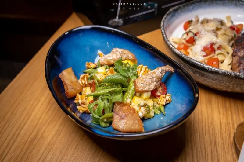 這道料理算是很特別的下酒菜,上面的炸魚塊底下是沙拉,調味帶著魚露味道跟辣度,上面的冰花菜口感很不錯。