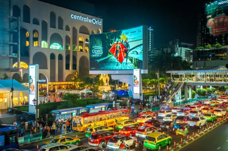 一走出來就充分感受到曼谷鬧區的絢麗,整個跟白天大不同啊。五顏六色的燈光相當繽紛。