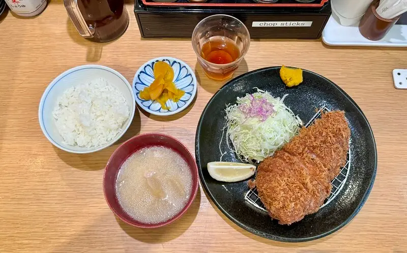 我點的是2200日幣,300公克的ロースかつ定食,除了炸豬排還有高麗菜絲,一碗白飯、醬菜和味噌湯。飲料提供的是冰的麥茶。