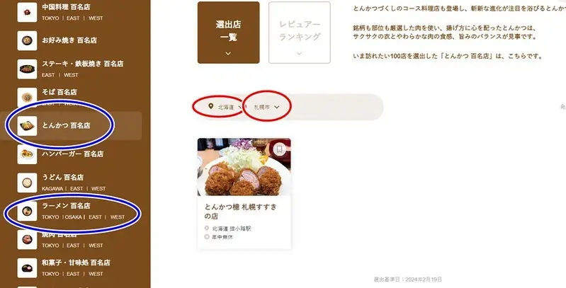 進入到「tabelog百名店」的app後,你會發現左側的料理選項條,一共有29個之多,在選項中找到自己有興趣的點擊,這邊附帶說明的是有些熱門、餐廳數較多的選項會細分成東日本及西日本,甚至拉麵還有單獨拉出東京和大阪,點擊炸豬排(藍圈),再點擊すべて(紅圈)之後可以發現「北海道」的字是比較有店入選的城市會變成深顏色,沒入選則是灰色。然後第二次點擊(すべて)可以更細分該縣更小的行政單元,比方我選的「札幌-薄野」,得到的答案有兩家分別是tabelog3.60的「とんかつ檍(薄野店)」,也是整個北海道唯一入選的。這個功能方便你快速找到你所處地區的tabelog入選,再配合你自己喜歡的選項,只要花十分鐘左右就能找到對應料理和地域的餐廳。