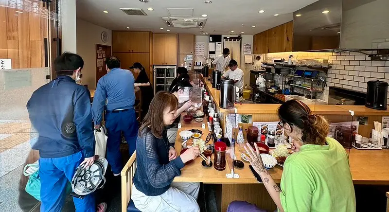 店裡就是一個像拉麵店的檯前,另外旁邊有兩三張,可以坐四人的小方桌,算一算差不多就是15-18人。就我來兩次才吃過的經驗,不想排隊就是開店前十分鐘就來,當第一批客人,避開主要附近上班族的用餐時間,理論上是不用等太久。像我11:15分左右到,是可以直接進店,但不到十分鐘就全滿了..照片是我用完餐約莫12點時拍的,外面已經有人在排隊。