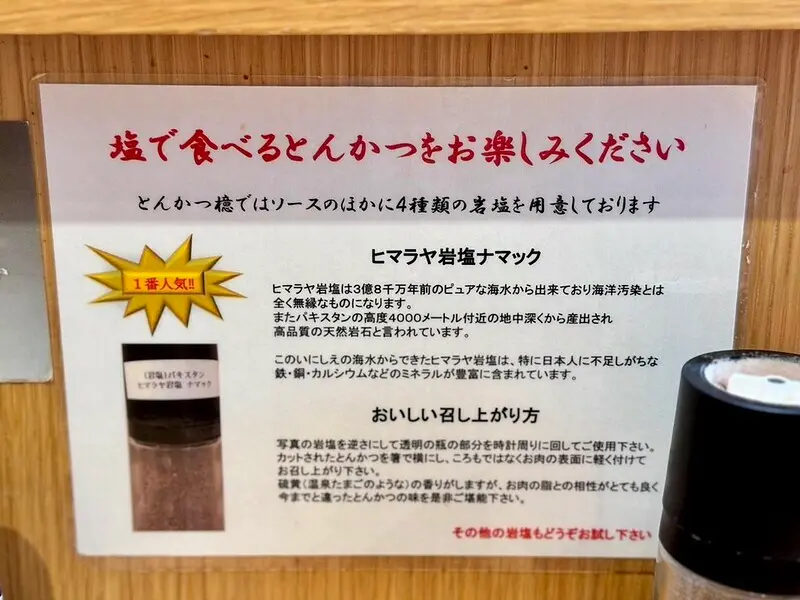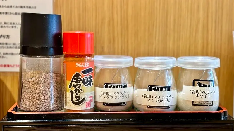 比較特別的是這裡的炸豬,除了一般豬排店常見的醬汁,還提供的是三四種不同的岩鹽,另外有胡椒和七味粉。