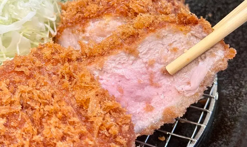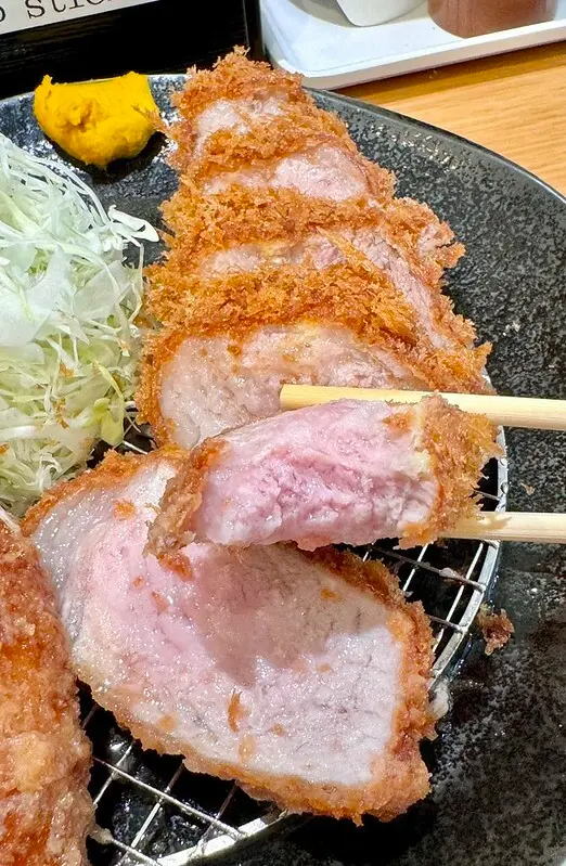 將切好的豬排排開後發現 ,豬肉的中間仍帶著粉嫩的顏色,猜想應該會有不少人覺得這豬肉沒熟吧?其實,如果你常吃日本這種厚 切炸豬排就知,多數都會帶點像樣的粉嫩,專業的說法那不是沒熟,而是肌紅蛋白(Myoglobin)」和「血紅蛋白(Hemoglobin)」。但,當然如果你還是擔心害怕,建議不要吃...甚至不要進這樣的餐廳。