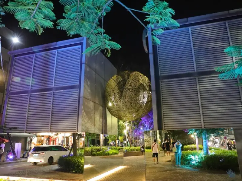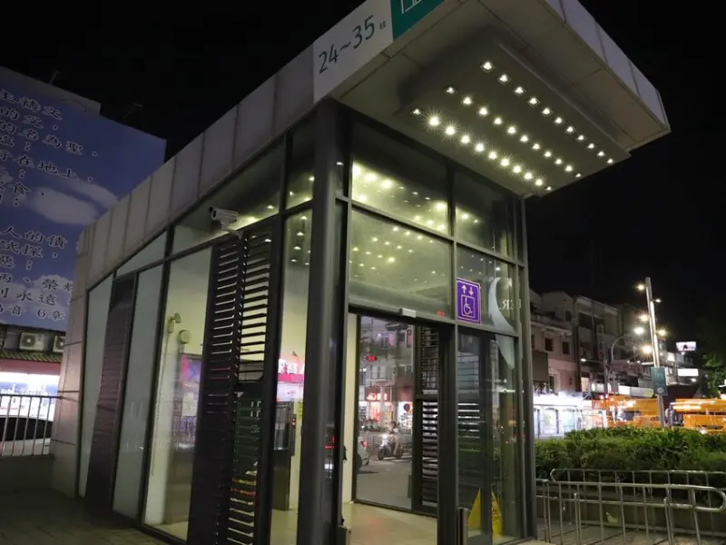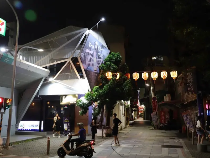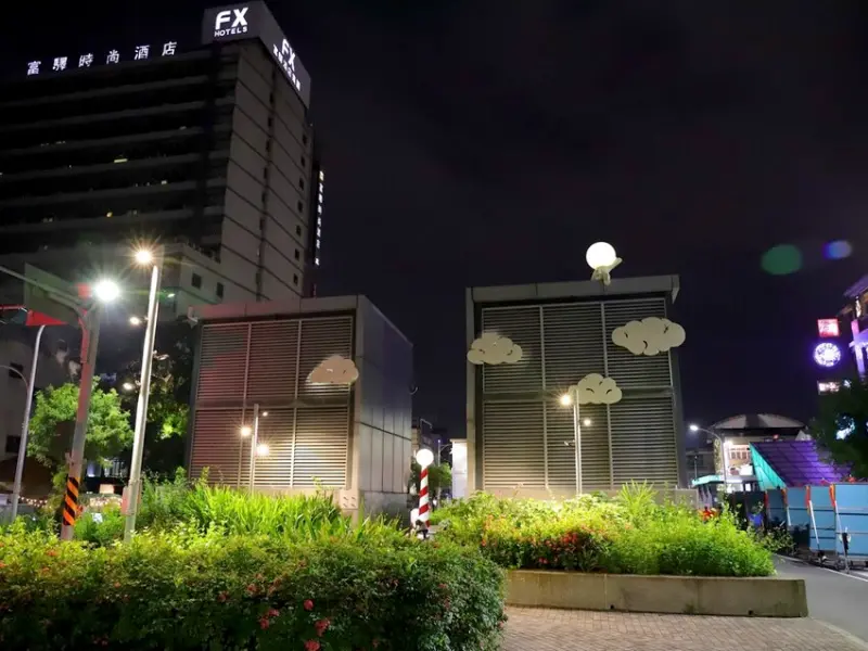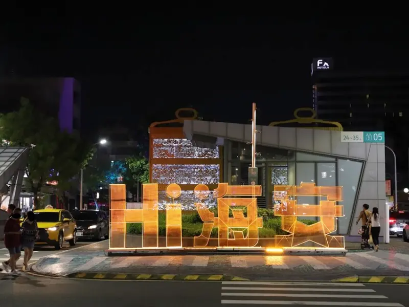 接下來,就順著走到海安路和中正路口,可以看到海安商圈的商圈LOGO。晚上拍起來特別美喔!旁邊就是街道美術館的作品:「厚禮」。往海安路地下停車場的電梯旁邊,本身也是藝術作品:「光電獸」。![]()